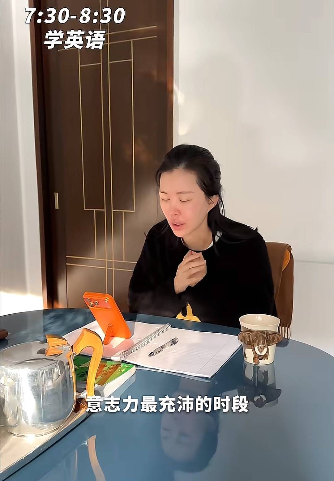 运动完之后,7点30分到8点30分,是田朴珺学习英语的时间段,只见素颜示人的田朴珺对着手机边读边记,注意力十分专注。原来这光鲜亮丽的背后,需要付出这么多努力。